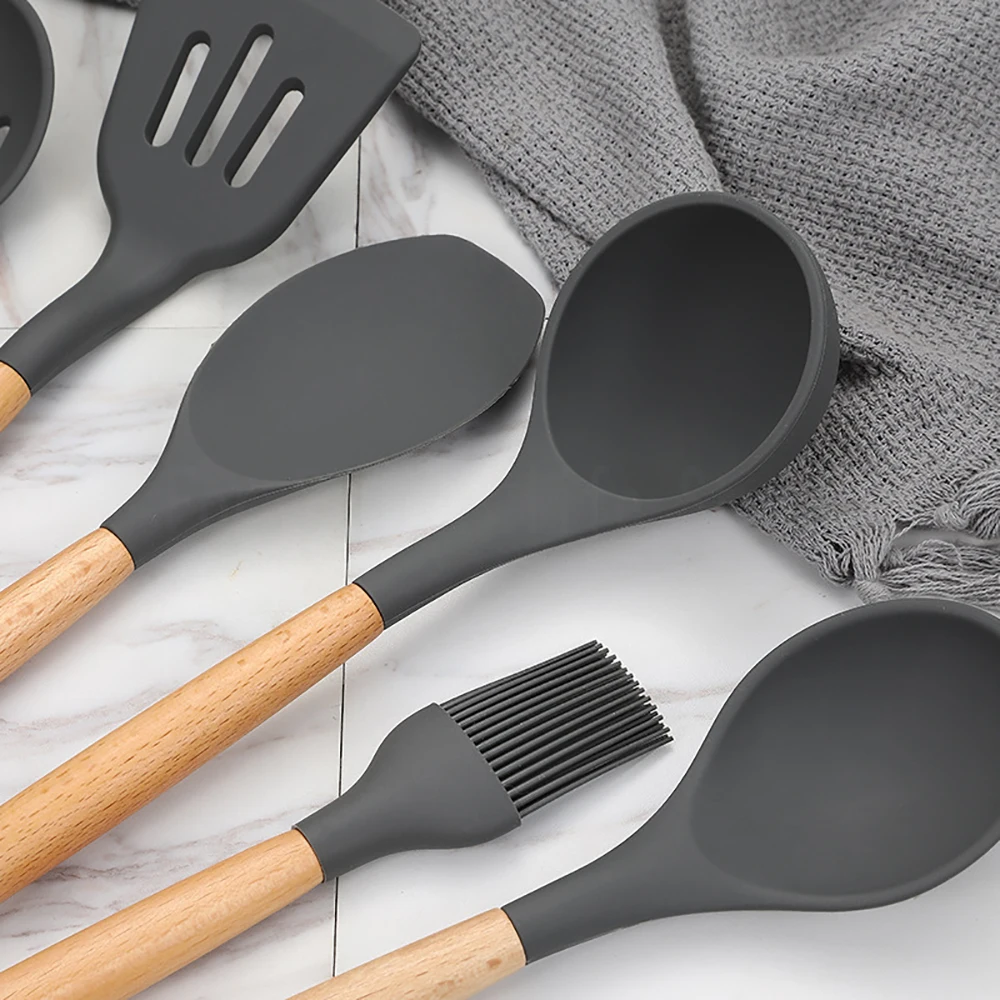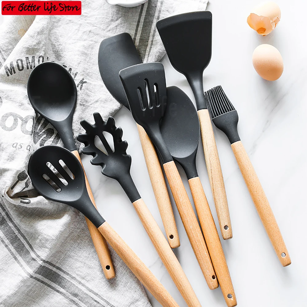 Conjunto de utensílios de silicone com cabos multifuncionais de madeira e acabamento antiaderente, incluindo espátula, pincel de confeitaria, espátula pontiaguda, espátula com borda arredondada, concha, espátula de borda reta, colher, pinça e garfo para massas. Perfeito para todos os tipos de alimentos e acessórios de cozinha, ideal para fritar, mexer cremes, manteiga, sorvete, entre outros.